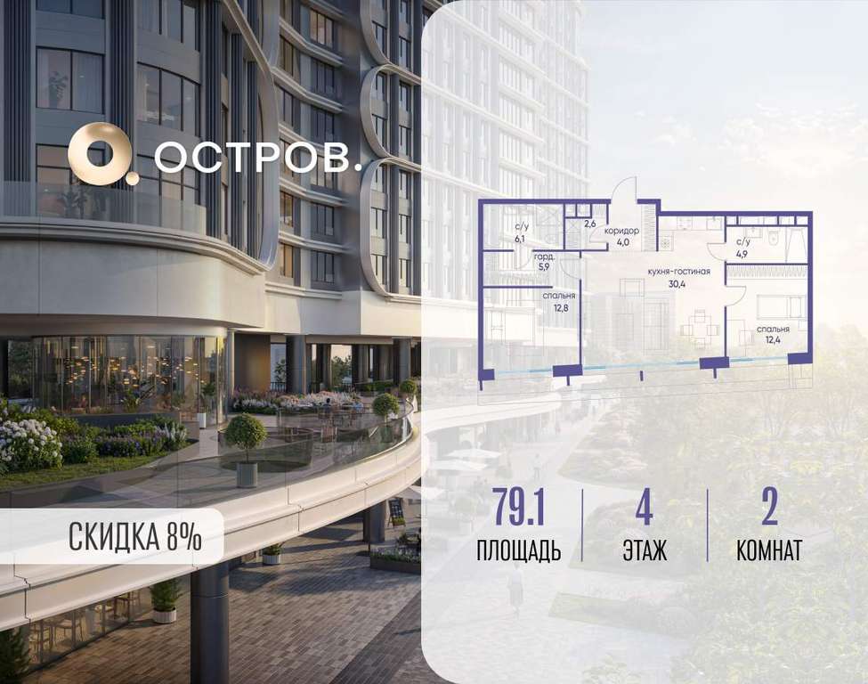 Продаётся 2-комн. квартира от застройщика: общая площадь 79.10 м, жилая 25.20 м, кухня 30.40 м, 4-й этаж, жилой квартал «Остров 7», корпус 3 (секция 1) . Срок сдачи: 1 квартал 2028 года.