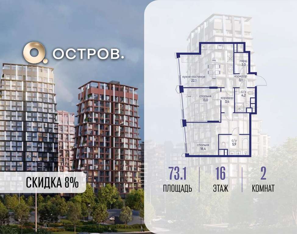 Продаётся 2-комн. квартира от застройщика: общая площадь 73.10 м, жилая 31.40 м, кухня 22.10 м, 16-й этаж, жилой квартал «Остров 14», корпус 4 (секция 1) . Срок сдачи: 2 квартал 2029 года.
