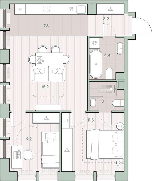 Жилая площадь 38.9 м2, кухня 7.8 м2, предчистовая отделка, комнаты изолированные.