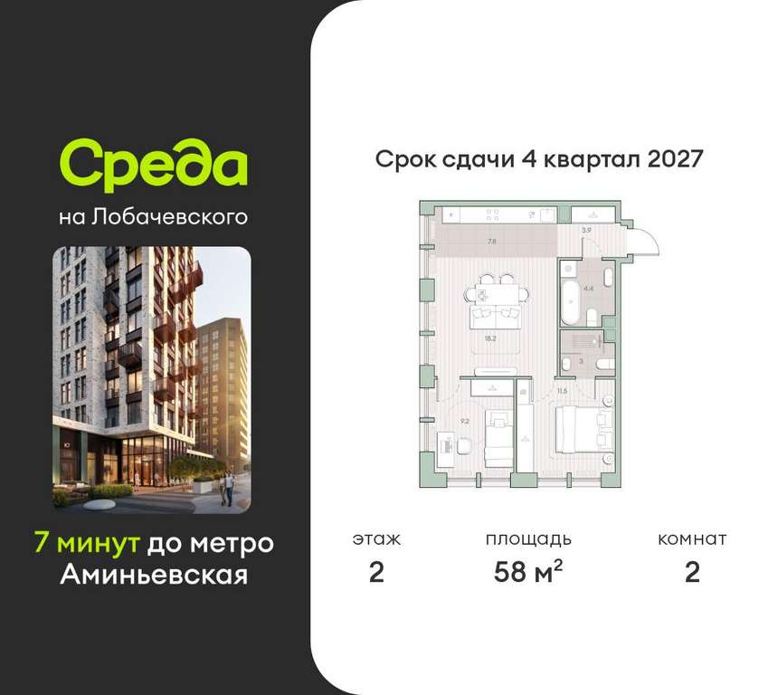 Застройщик - Среда, сдача дома - II квартал 2027 года, высота потолков 2.92 м.