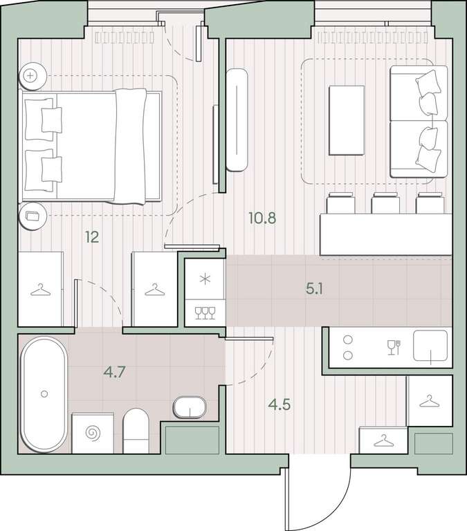 Жилая площадь 22.8 м2, кухня 5.1 м2, квартира без отделки, комнаты изолированные.