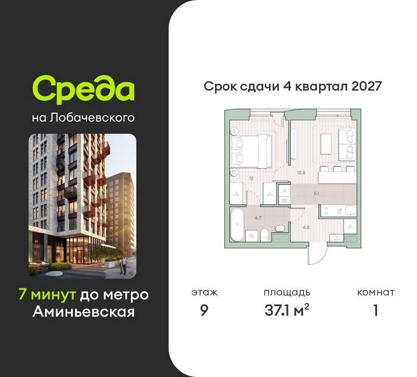 Квартира располагается на 9 этаже 27-этажного дома в ЖК Среда на Лобачевского.