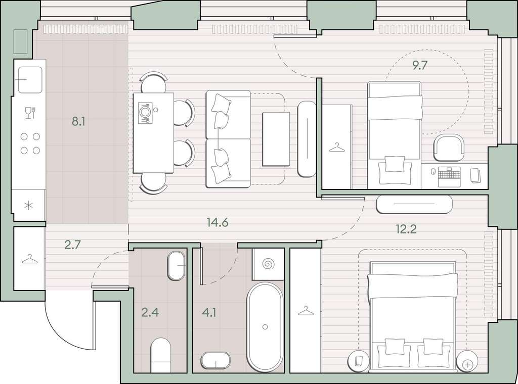 Жилая площадь 36.5 м2, кухня 8.1 м2, предчистовая отделка, комнаты изолированные.