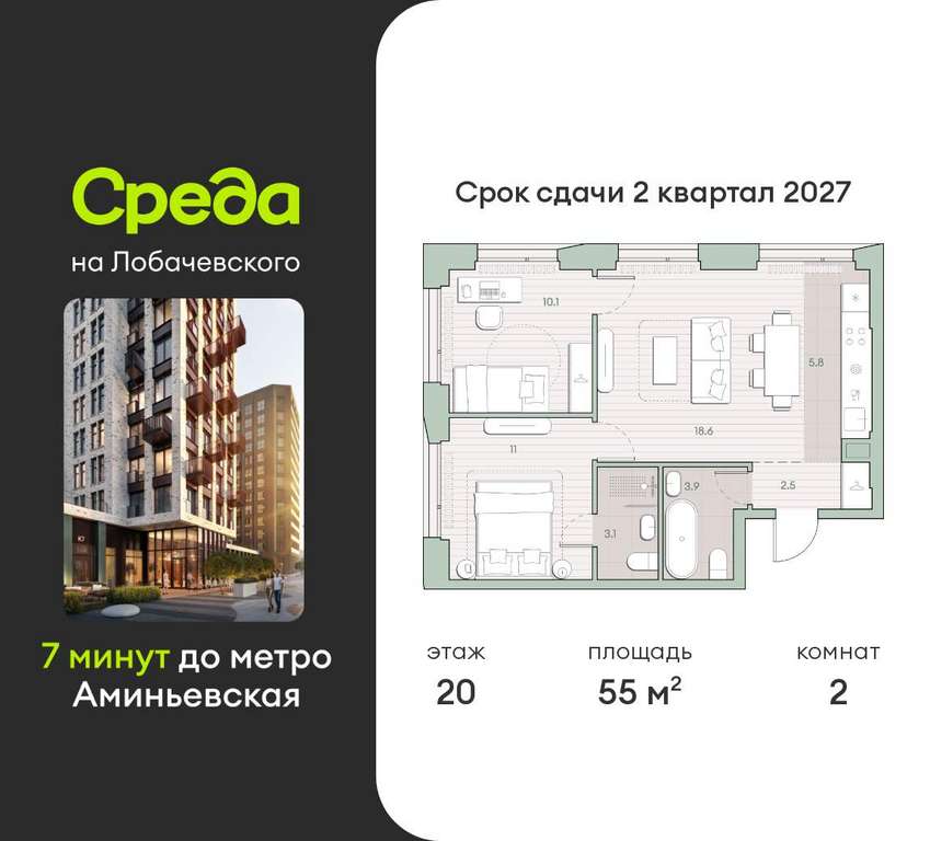 Застройщик - Среда, сдача дома - II квартал 2027 года, высота потолков 2.92 м.