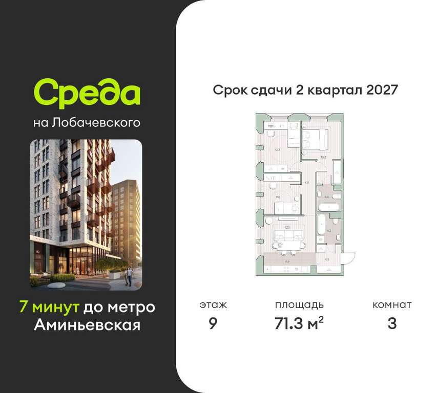 Застройщик - Среда, сдача дома - II квартал 2027 года, высота потолков 2.92 м.