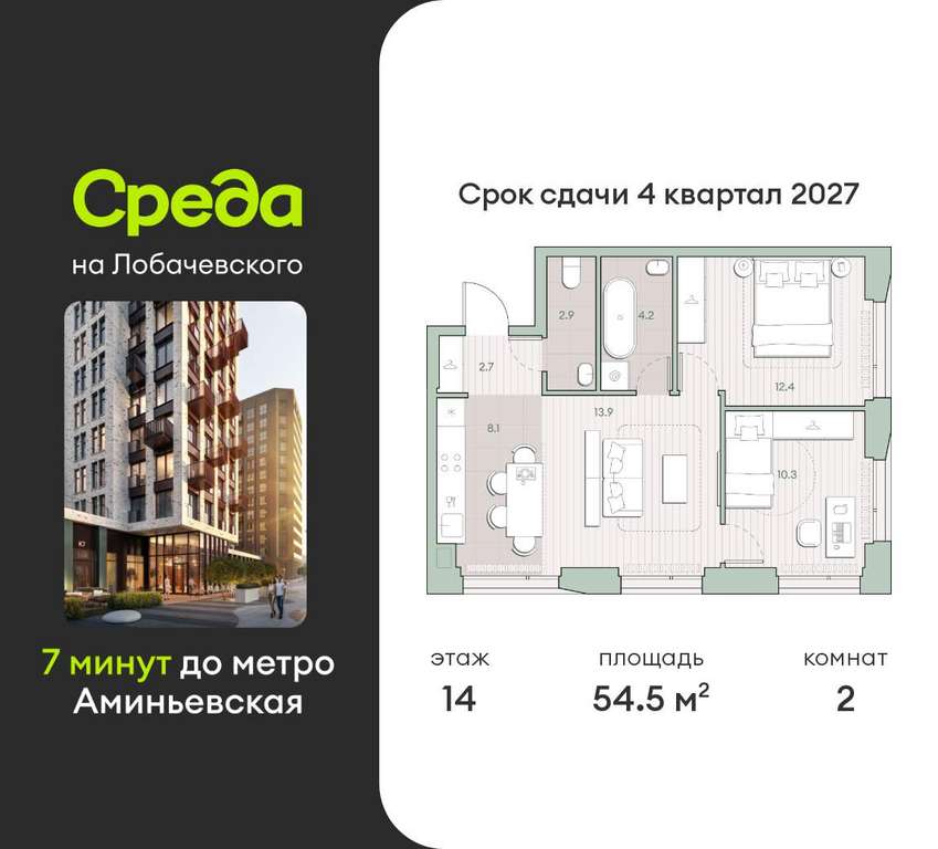 Квартира располагается на 14 этаже 27-этажного дома в ЖК Среда на Лобачевского.