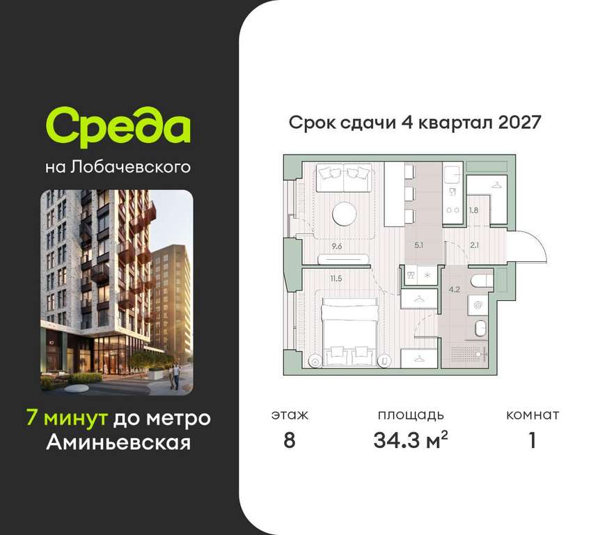 Застройщик - Среда, сдача дома - IV квартал 2027 года, высота потолков 2.92 м.