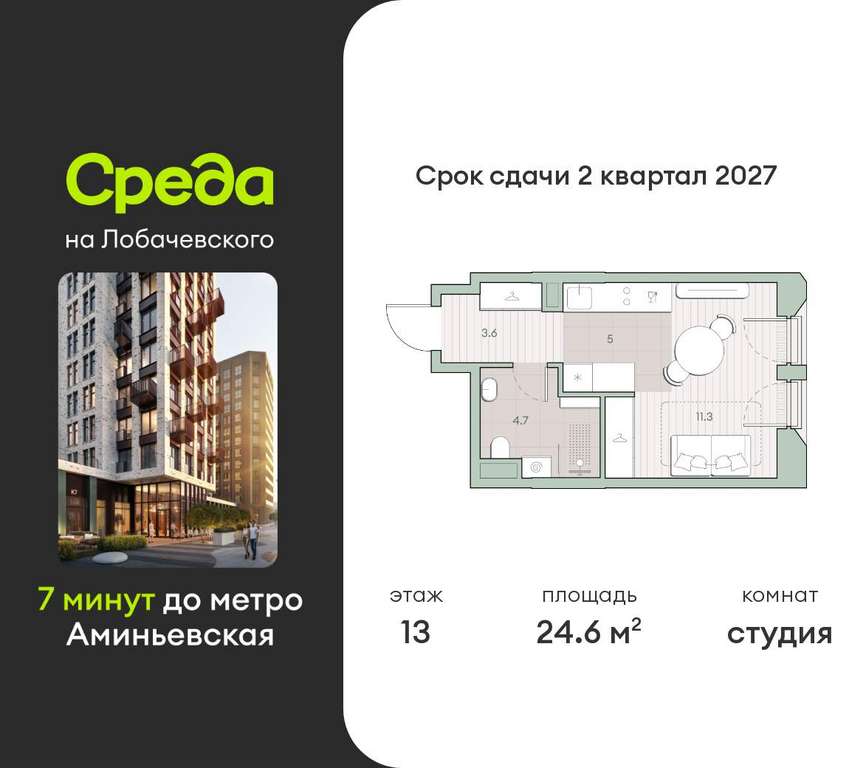 Застройщик - Среда, сдача дома - II квартал 2027 года, высота потолков 2.92 м.