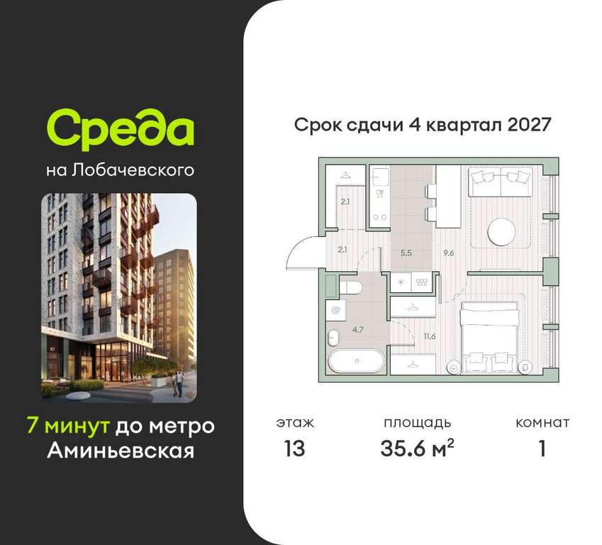Квартира располагается на 13 этаже 13-этажного дома в ЖК Среда на Лобачевского.