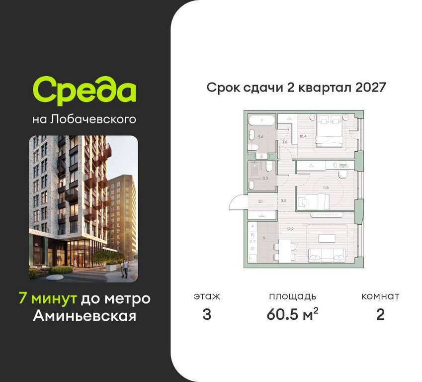 Застройщик - Среда, сдача дома - II квартал 2027 года, высота потолков 2.92 м.
