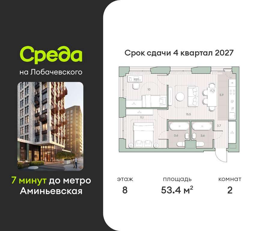 Застройщик - Среда, сдача дома - IV квартал 2027 года, высота потолков 2.92 м.