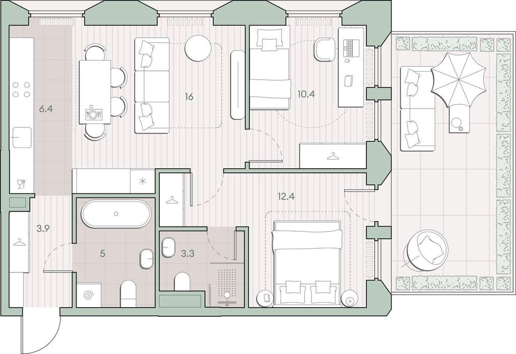 Жилая площадь 38.8 м2, кухня 6.4 м2, предчистовая отделка, комнаты изолированные.