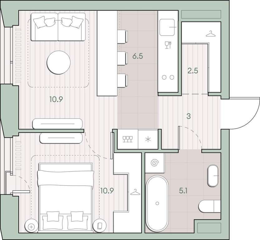 Жилая площадь 21.8 м2, кухня 6.5 м2, квартира без отделки, комнаты изолированные.