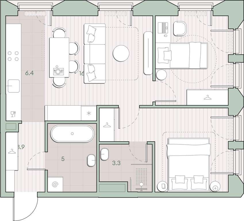 Жилая площадь 38.8 м2, кухня 6.4 м2, предчистовая отделка, комнаты изолированные.
