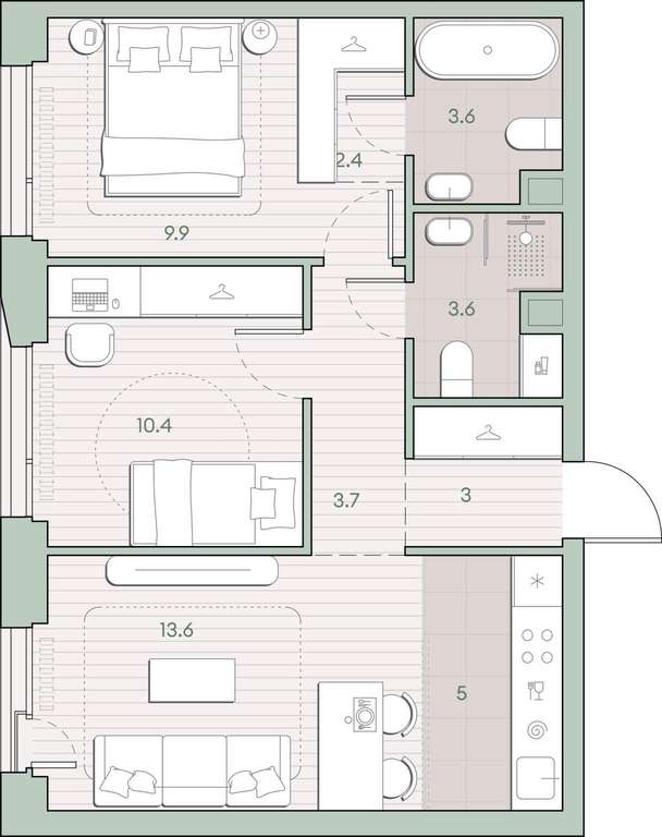 Жилая площадь 33.9 м2, кухня 5 м2, предчистовая отделка, комнаты изолированные.