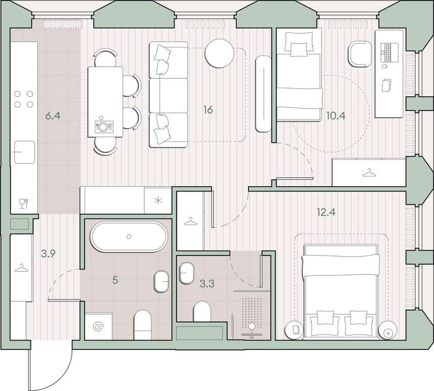 Жилая площадь 38.8 м2, кухня 6.4 м2, предчистовая отделка, комнаты изолированные.