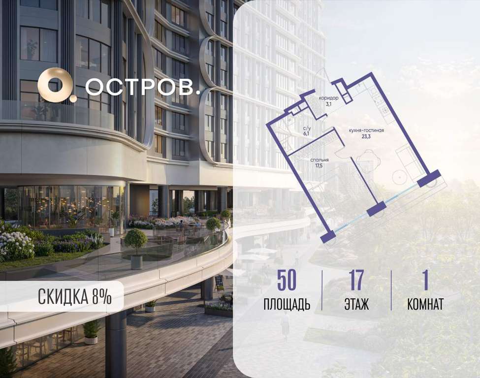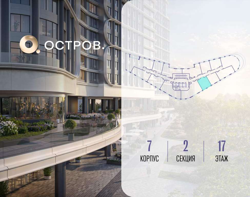 Продаётся 1-комн. квартира от застройщика: общая площадь 50.00 м, жилая 17.50 м, кухня 23.30 м, 17-й этаж, жилой квартал «Остров 7», корпус 7 (секция 2) . Срок сдачи: 3 квартал 2028 года.