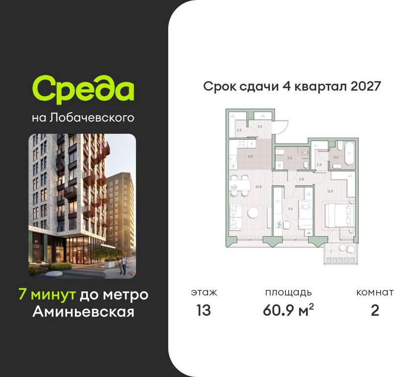 Квартира располагается на 13 этаже 13-этажного дома в ЖК Среда на Лобачевского.