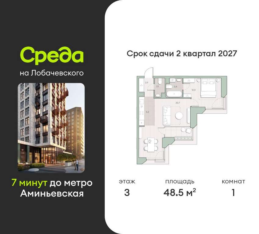 Квартира располагается на 3 этаже 13-этажного дома в ЖК Среда на Лобачевского.