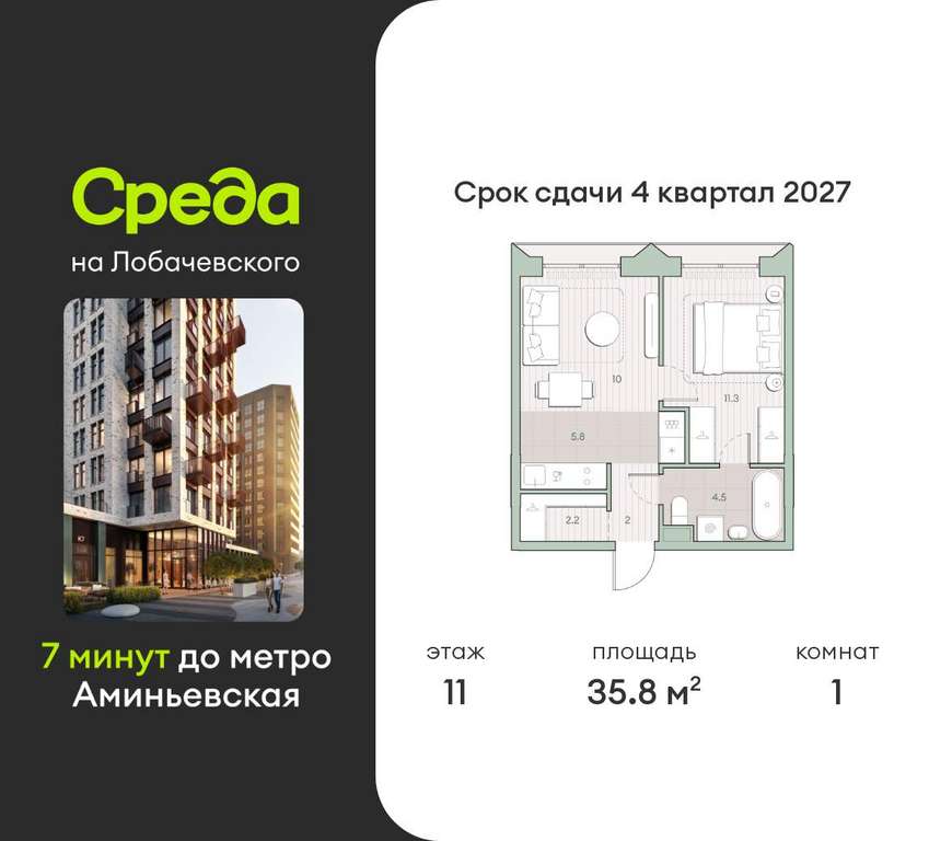 Квартира располагается на 11 этаже 13-этажного дома в ЖК Среда на Лобачевского.