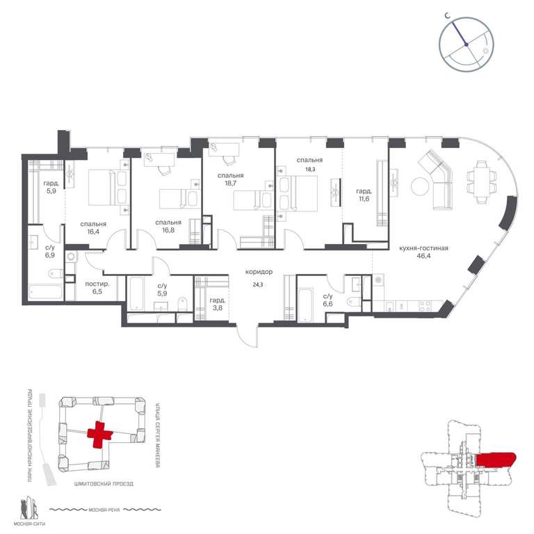 Жилой проект расположен в Пресненском районе Москвы. В пешей доступности находятся станции метро: «Улица 1905 года» (19 минут) , «Москва-Сити» (24 минуты) и «Деловой центр (Выставочная) » (25 минут) .