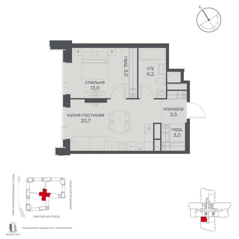 Жилой проект расположен в Пресненском районе Москвы. В пешей доступности находятся станции метро: «Улица 1905 года» (19 минут) , «Москва-Сити» (24 минуты) и «Деловой центр (Выставочная) » (25 минут) .