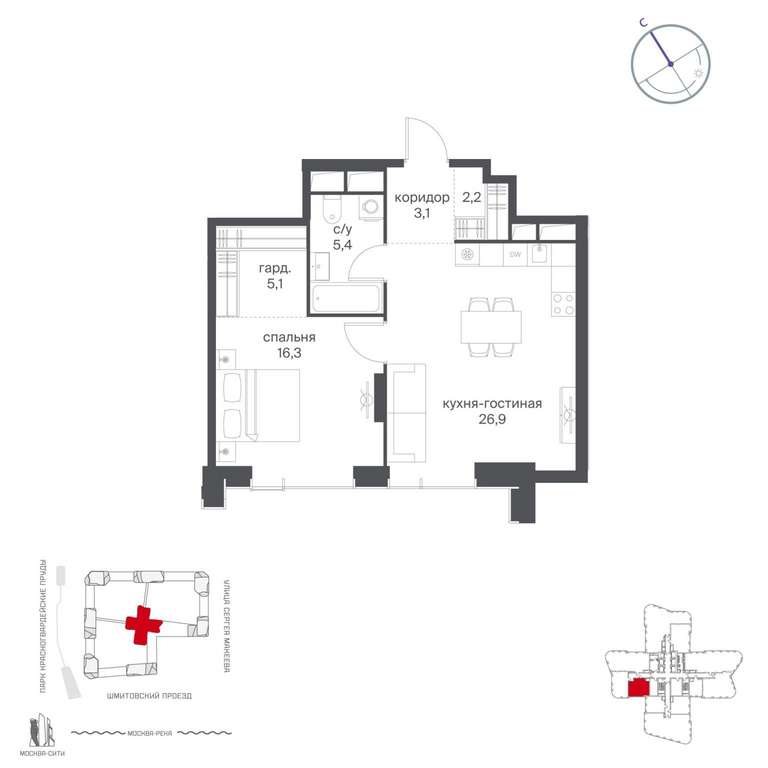 Жилой проект расположен в Пресненском районе Москвы. В пешей доступности находятся станции метро: «Улица 1905 года» (19 минут) , «Москва-Сити» (24 минуты) и «Деловой центр (Выставочная) » (25 минут) .