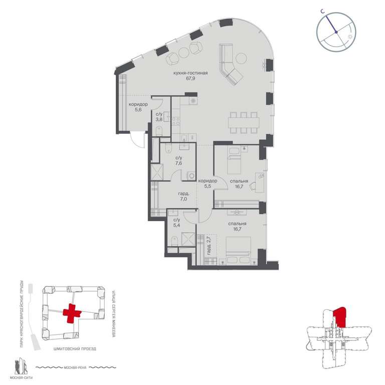 Жилой проект расположен в Пресненском районе Москвы. В пешей доступности находятся станции метро: «Улица 1905 года» (19 минут) , «Москва-Сити» (24 минуты) и «Деловой центр (Выставочная) » (25 минут) .