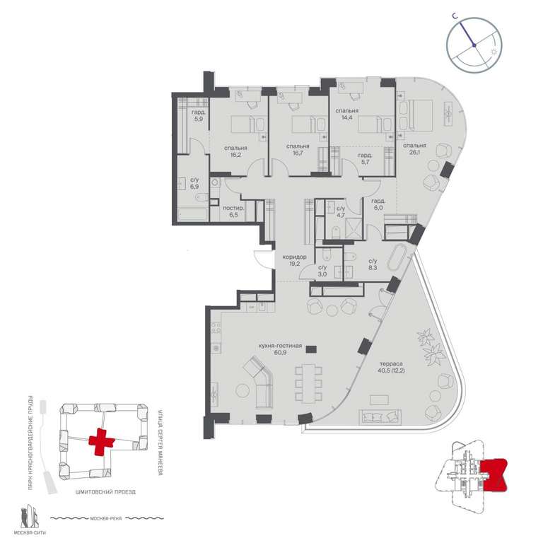 Жилой проект расположен в Пресненском районе Москвы. В пешей доступности находятся станции метро: «Улица 1905 года» (19 минут) , «Москва-Сити» (24 минуты) и «Деловой центр (Выставочная) » (25 минут) .