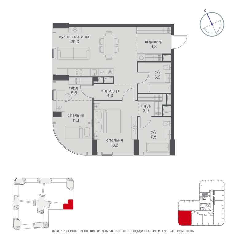 Жилая площадь 59 м2, кухня 26 м2, квартира без отделки, комнаты изолированные, совмещенных санузлов - 1, балконов - 1.