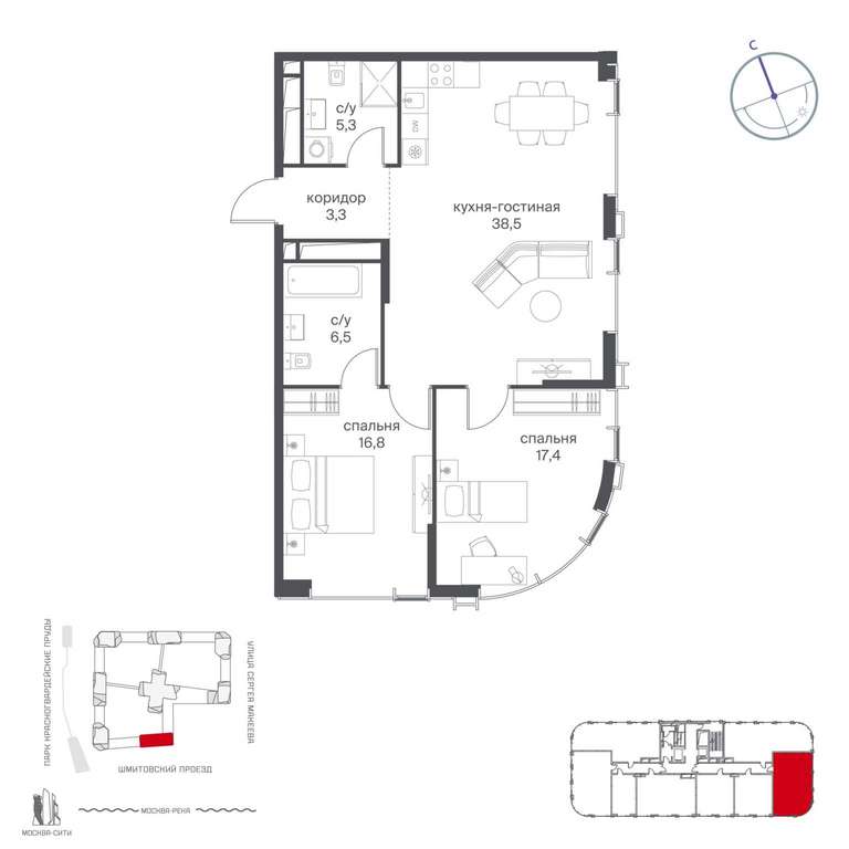 Жилой проект расположен в Пресненском районе Москвы. В пешей доступности находятся станции метро: «Улица 1905 года» (19 минут) , «Москва-Сити» (24 минуты) и «Деловой центр (Выставочная) » (25 минут) .
