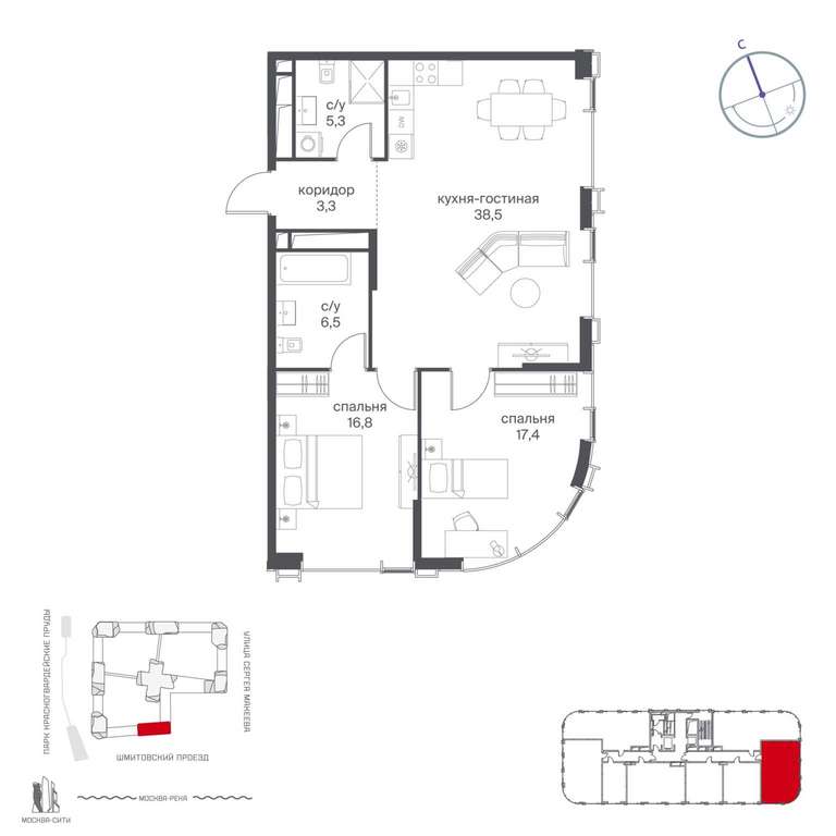 Жилой проект расположен в Пресненском районе Москвы. В пешей доступности находятся станции метро: «Улица 1905 года» (19 минут) , «Москва-Сити» (24 минуты) и «Деловой центр (Выставочная) » (25 минут) .