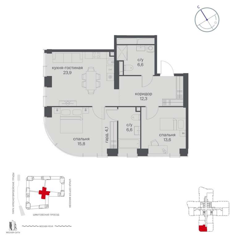 Жилой проект расположен в Пресненском районе Москвы. В пешей доступности находятся станции метро: «Улица 1905 года» (19 минут) , «Москва-Сити» (24 минуты) и «Деловой центр (Выставочная) » (25 минут) .