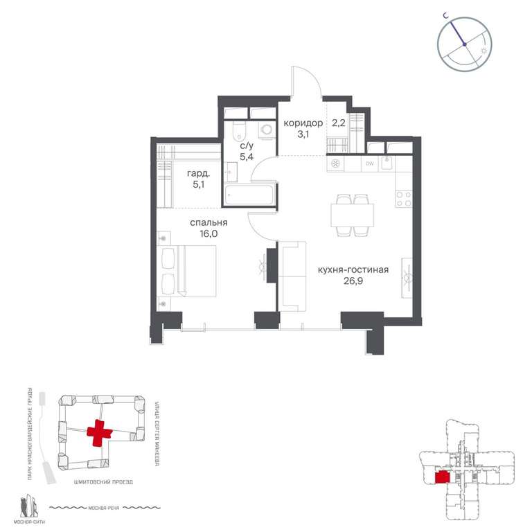 Жилой проект расположен в Пресненском районе Москвы. В пешей доступности находятся станции метро: «Улица 1905 года» (19 минут) , «Москва-Сити» (24 минуты) и «Деловой центр (Выставочная) » (25 минут) .