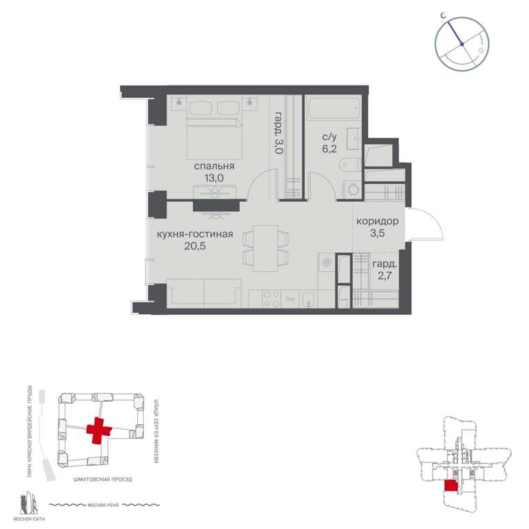 Жилой проект расположен в Пресненском районе Москвы. В пешей доступности находятся станции метро: «Улица 1905 года» (19 минут) , «Москва-Сити» (24 минуты) и «Деловой центр (Выставочная) » (25 минут) .