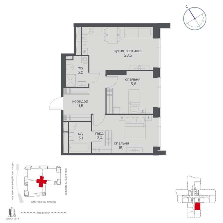 Жилой проект расположен в Пресненском районе Москвы. В пешей доступности находятся станции метро: «Улица 1905 года» (19 минут) , «Москва-Сити» (24 минуты) и «Деловой центр (Выставочная) » (25 минут) .