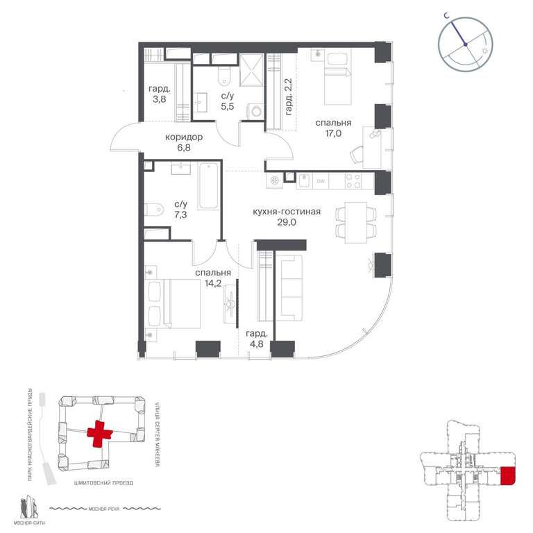 Квартира располагается на 11 этаже 48-этажного дома в ЖК Начало.