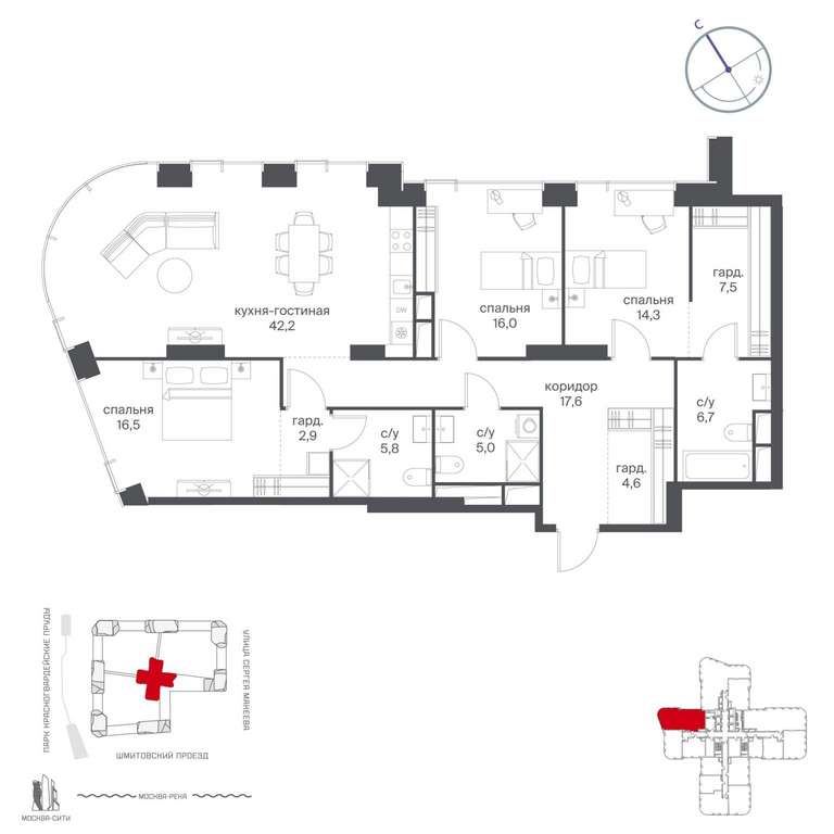 Подземная парковка, парковка охраняется. Обеспечение безопасности: видеонаблюдение, круглосуточная охрана, консьерж, противопожарная система, пропускная система. Инфраструктура: детские площадки, спортивные площадки, места для отдыха, рестораны, фитнес-центр, коммерческие объекты.