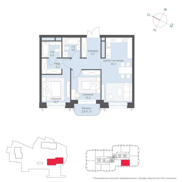 Жилая площадь 51 м2, кухня 26 м2, квартира без отделки, комнаты изолированные, совмещенных санузлов - 1, балконов - 1.