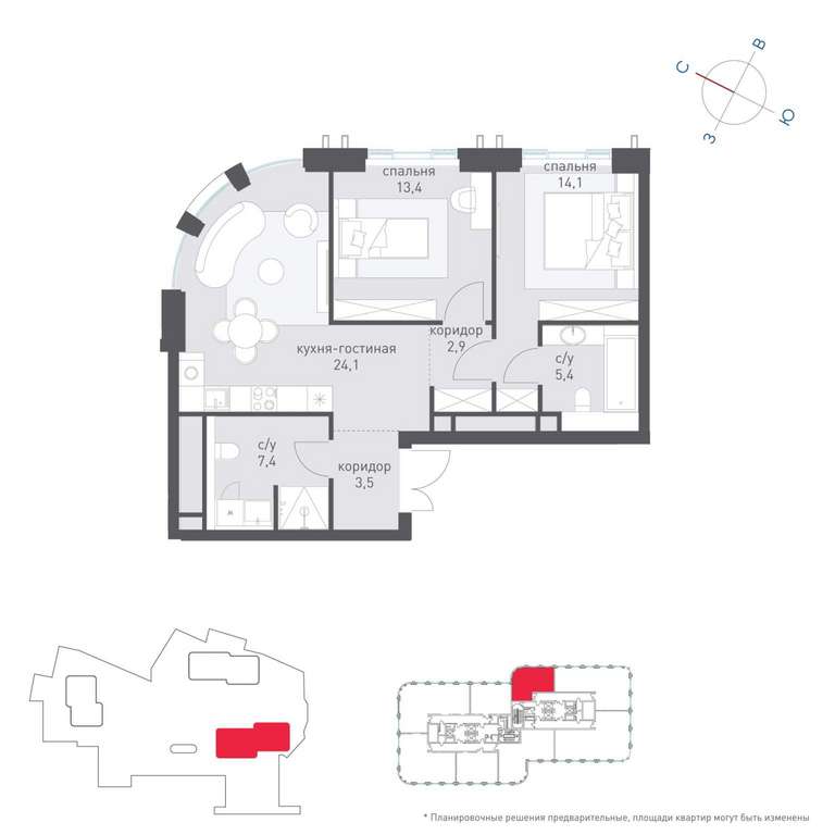 Квартира располагается на 21 этаже 24-этажного дома в ЖК Татарская 35.