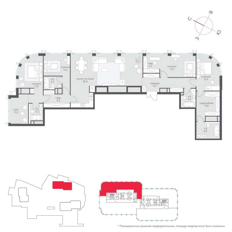 Квартира располагается на 18 этаже 19-этажного дома в ЖК Татарская 35.