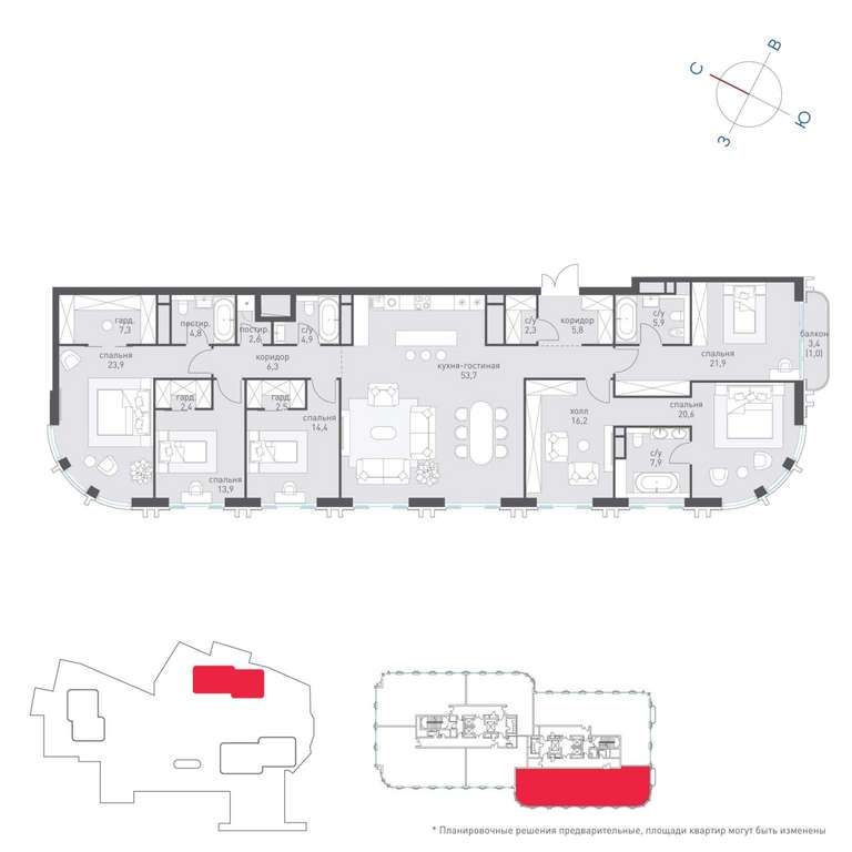 Жилая площадь 214 м2, кухня 11 м2, квартира без отделки, комнаты изолированные, совмещенных санузлов - 1, балконов - 1.