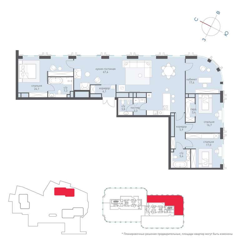 Квартира располагается на 18 этаже 19-этажного дома в ЖК Татарская 35.