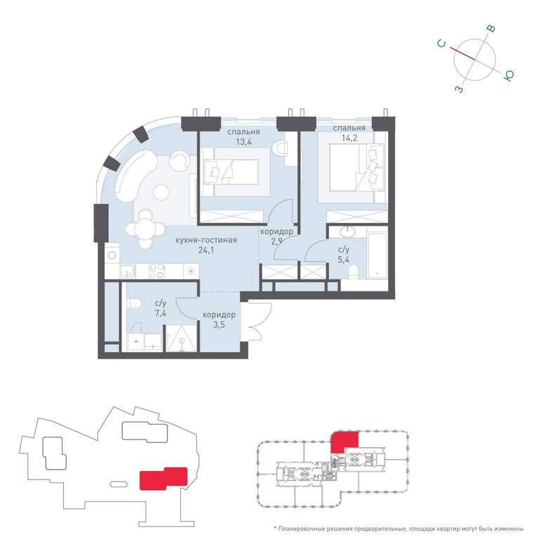 Квартира располагается на 15 этаже 24-этажного дома в ЖК Татарская 35.