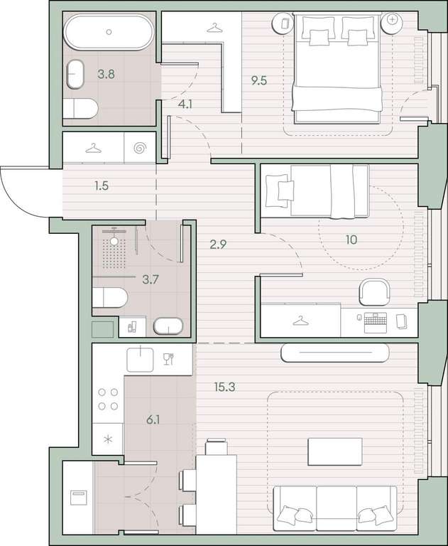 Жилая площадь 34.8 м2, кухня 6.1 м2, предчистовая отделка, комнаты изолированные.