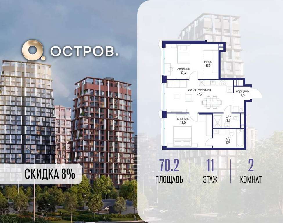 Продаётся 2-комн. квартира от застройщика: общая площадь 70.20 м, жилая 29.40 м, кухня 22.20 м, 11-й этаж, жилой квартал «Остров 14», корпус 6 (секция 1) . Срок сдачи: 2 квартал 2029 года.