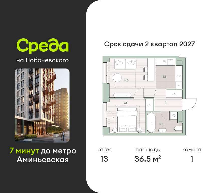 Квартира располагается на 13 этаже 27-этажного дома в ЖК Среда на Лобачевского.