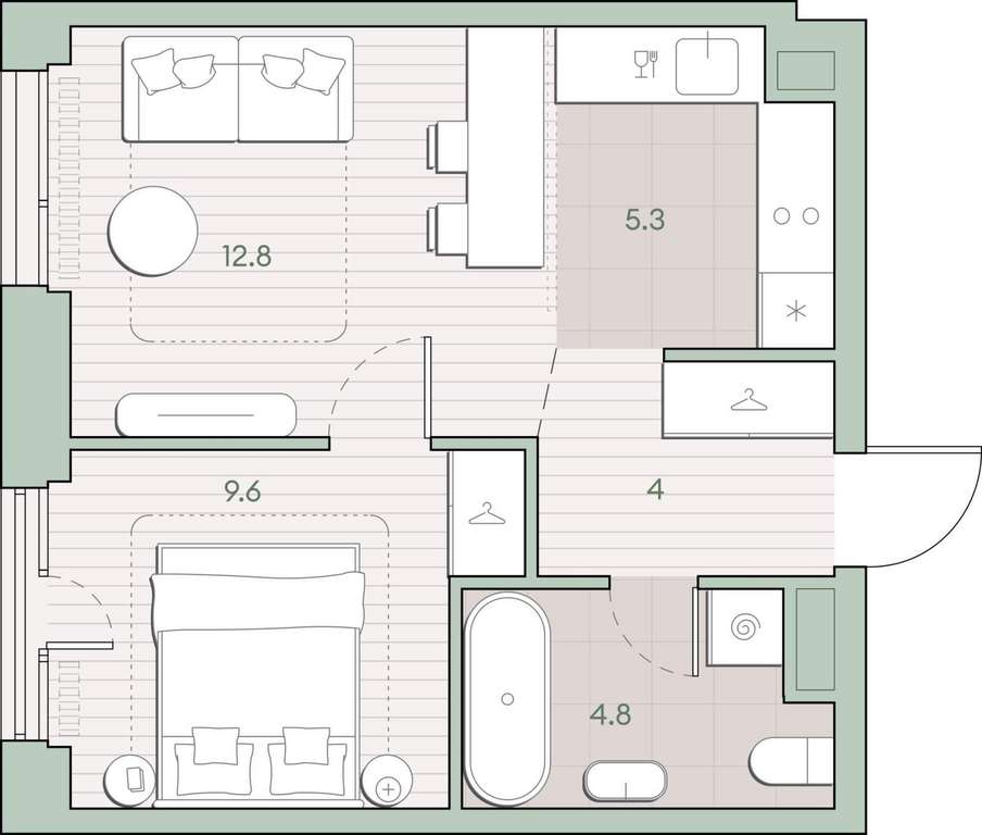 Жилая площадь 22.4 м2, кухня 5.3 м2, предчистовая отделка, комнаты изолированные.
