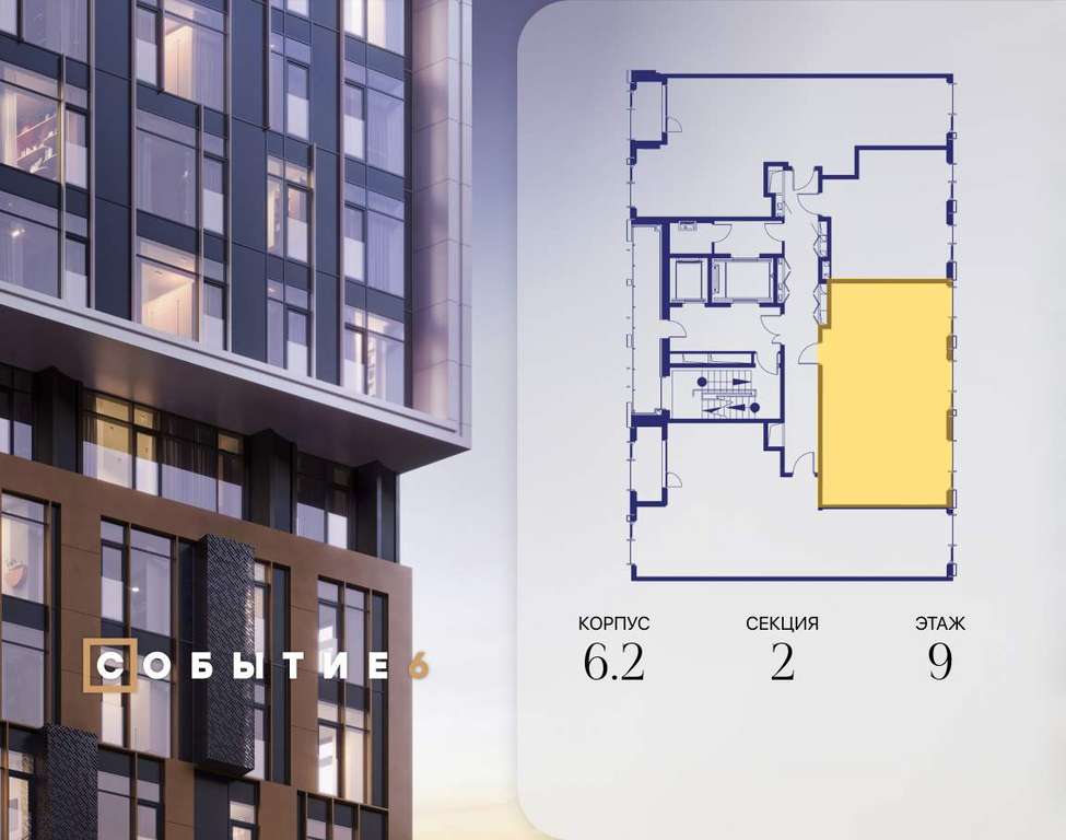 Продаётся 2-комнатная квартира от застройщика: общая площадь 62.30 м, жилая 28.80 м, кухня 22.10 м, 9-й этаж, жилой квартал «Событие-6», корпус 2 (секция 2) Срок сдачи: 4 квартал 2029 года.