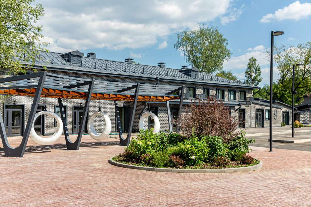 Отделка фасадов выполнена панелями с имитацией клинкерного кирпича. Дополнительно на территории организованы зоны отдыха, также дополнительно имеется возможность для организации летних веранд и кафе.